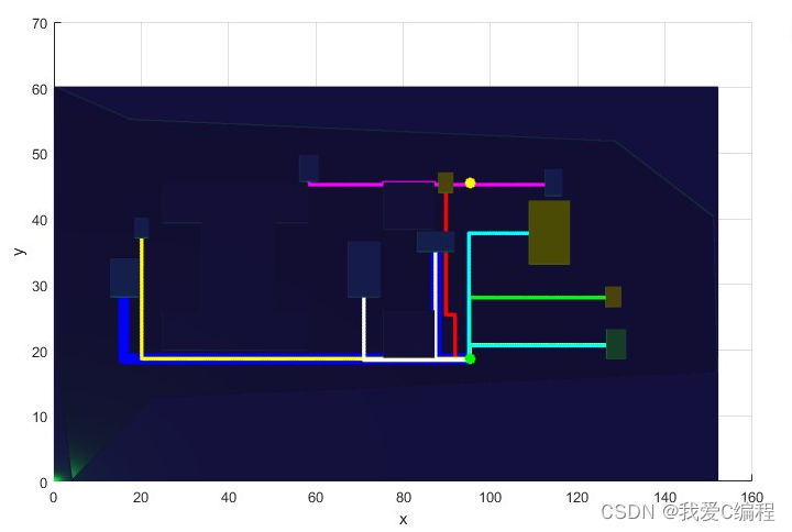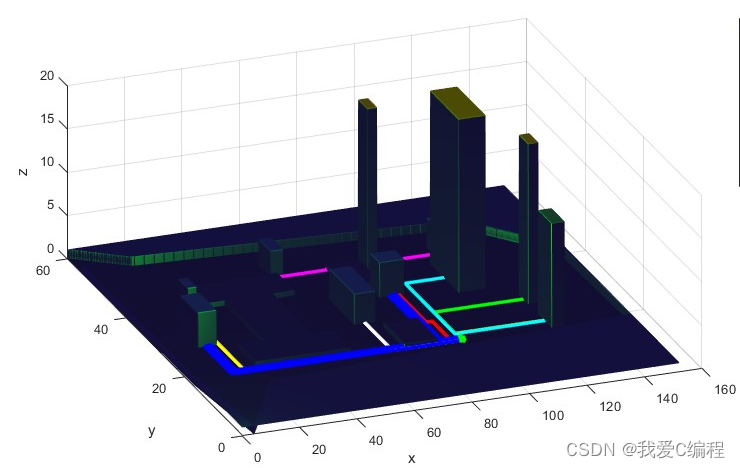 要求每条道路路线不得横穿运输路线上所经设施以外的其他设施或固定建筑,故需用A算法确定路线(若有更好 的算法也可替代),又因为道路有最小宽度的要求,R1宽度为5m,R2至R7宽度为3m,可以通过为A算法划分不同大小的网格(3×3或5×5)来实现宽度的考虑(有别的更好地想法也可提出)