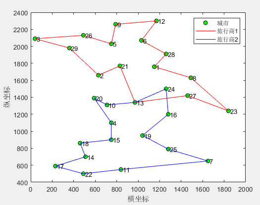 蜣螂优化算法求解两个旅行商的SD-MTSP其中一次的效果如下: