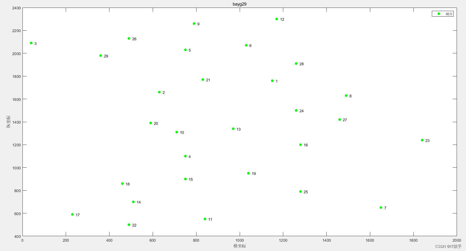 本文选取国际通用的TSP实例库TSPLIB中的测试集bayg29,bayg29中城市分布如下图所示: