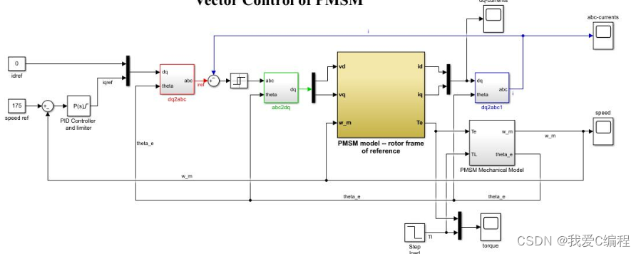 永磁同步电机的运行原理与电励磁同步电机相同,但它以永磁体提供的磁通代替后者的励磁绕组励磁,使电机结构更为简单。PMSM是由永磁体励磁产生同步旋转磁场的同步电机,永磁体作为转子产生旋转磁场,三相定子绕组在旋转磁场作用下通过电枢反应,感应三相对称电流。此时转子动能转化为电能,PMSM作发电机(generator)用;此外,当定子侧通入三相对称电流,由于三相定子在空间位置上相差120,所以三相定子电流在空间中产生旋转磁场,转子旋转磁场中受到电磁力作用运动,此时电能转化为动能,PMSM作电动机(motor)用 。矢量控制(vector control)也称为磁场导向控制(field-oriented control,简称FOC),是一种利用变频器(VFD)控制三相交流电机的技术,利用调整变频器的输出频率、输出电压的大小及角度,来控制交流电机的输出。