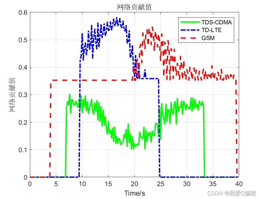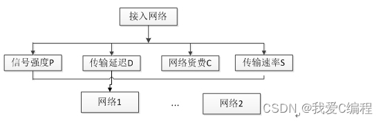根据终端位置信息,基站向终端提供网络带宽、时延等参数。以QoS最优化为目标确定能代表网络性能的属性量决策,通过选择几个比较重要的属性参数,属性层为影响网络选择的决定性因素:信号强度P、服务速率S、网络延迟D、网络的使用费用C,如图4.2所示,为各网络属性加权示意图: