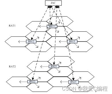联合接纳控制是一种集中式的接纳控制,多种RAT在相同的区域进行覆盖,形成了多RAT的网络结构。每一种无线接入技术RAT(Radio Access Technology)由若干个基站BS(Base Station)组成,每个BS根据需要,管理相应的多个小区,每个BS对所属的多个小区进行接纳控制,将网络信息上报到JAC实体,由JAC做出接纳判决。具体系统模型,如下图1所示: