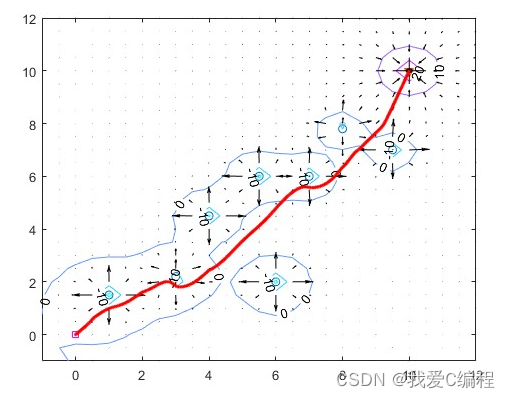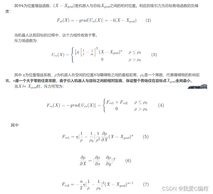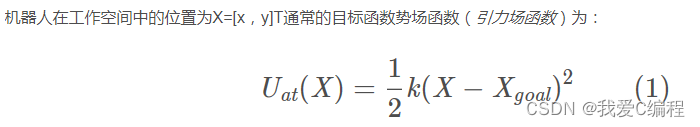 人工势场法路径规划是由Khatib提出的一种虚拟力法(Oussama Khatib,Real-Time Obstacle Avoidance for Manipulators and Mobile Robots. Proc of The 1985 IEEE.)。它的基本思想是将机器人在周围环境中的运动,设计成一种抽象的人造引力场中的运动,目标点对移动机器人产生“引力”,障碍物对移动机器人产生“斥力”,最后通过求合力来控制移动机器人的运动。应用势场法规划出来的路径一般是比较平滑并且安全,但是这种方法存在局部最优点问题。