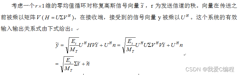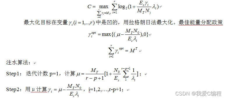 注水算法是根据某种准则,并根据信道状况对发送功率进行自适应分配,通常是信道状况好的时刻,多分配功率,信道差的时候,少分配功率,从而最大化传输速率。实现功率的注水分配,发送端必须知道CSI。当接收端完全知道信道而发送端不知道信号时,发送天线阵列中的功率平均分配是合理的。当发送端知道信道,可以增加信道容量。