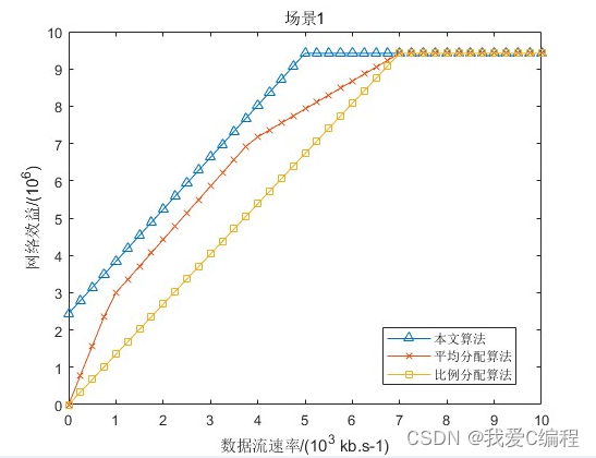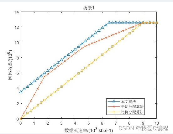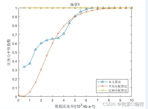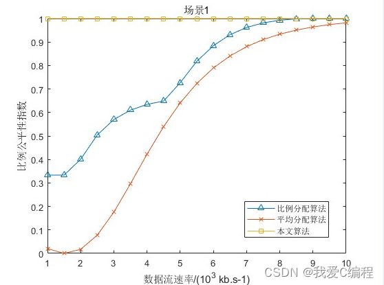 从图 3可知:场景:1中比例分配法的比例公平性指数最优,文中算法的比例公平性指数仅在大部分情况下优于平均分配法; 场景 2 中文中算法的比例公平性指数与比例分配法相同,传输速率按比例均衡分配。