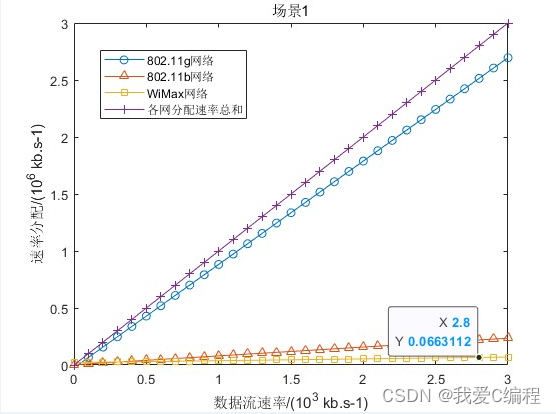 从仿真图中可见,3个接入网的资源占用情况不同,802.11g的信道利用率最低,网络负载最轻,业务流倾向于选择信道利用率低的网络进行接入:当业务流速率低于1.1Mb/s时,仅IEEE802.11g网络被选用并进行传输,相对重载的IEEE802.11b没有数据传输,避免了接入用户数增多而导致的碰撞率增大,因为可用带宽低,WIMAX直到业务流速率需求超过2.1Mb/s时才参与合作传输。