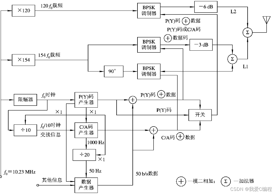 最早的GPS包含L1和L2两个频段,其中L1上调制CA码,P码以及导航电文,L2上调制P码和导航电文。在实际接收到的GPS信号中,我们除了能够接受到CA码和P码外,还能检测到L1和L2两种载波信号。