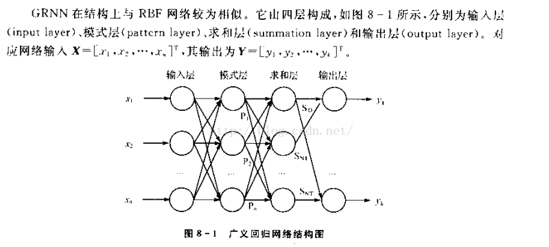 GRNN是RBF的一种改进,结构相似。区别就在于多了一层求和层,而去掉了隐含层与输出层的权值连接(对高斯权值的最小二乘叠加)。