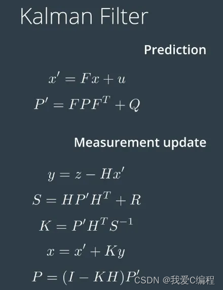 扩展卡尔曼滤波的初始化,需要将各个变量进行设置,对于不同的运动模型,状态向量是不一样的。为了保证代码对不同状态向量的兼容性,我们使用Eigen库中非定长的数据结构。初始化扩展卡尔曼滤波器时需要输入一个初始的状态量x_in,用以表示障碍物最初的位置和速度信息,一般直接使用第一次的测量结果。这两个公式求的是卡尔曼滤波器中一个很重要的量——卡尔曼增益K(Kalman Gain),用人话讲就是求差值y的权值。第一个公式中的R是测量噪声矩阵(measurement covariance matrix),这个表示的是测量值与真值之间的差值。一般情况下,传感器的厂家会提供。