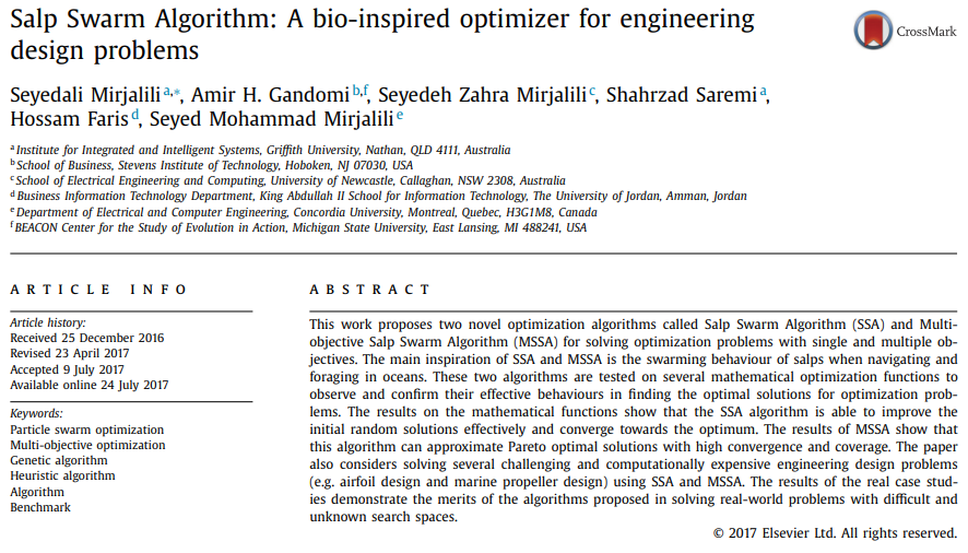 参考文献:S. Mirjalili, A.H. Gandomi, S.Z. Mirjalili, S. Saremi, H. Faris, S.M. Mirjalili,Salp Swarm Algorithm: A bio-inspired optimizer for engineering design problems ,Advances in Engineering Software. DOI: http://dx.doi.org/10.1016/j.advengsoft.2017.07.002