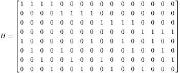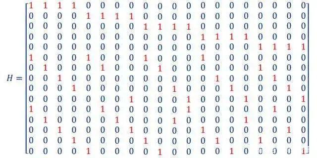 在LDPC编码中,会用到一个叫做H矩阵的校验矩阵(Parity Check Matrix),比如,我们来看一个简单的H矩阵: