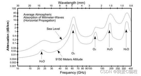 由于大气中存在一定含量的极化氧分子和水汽,因此毫米波在传输过程中容易被大气吸收,从而导致信号衰减,影响通信质量[13,14]。根据相关研究发现,在一些特殊的频段,如60GHz、119GHz、183GHz,这种影响更为严重,在实际中应防止使用这些频段。而在其余一些频段,则通信性能较好,如35GHz、140GHz、220GHz等。图3.1给出了毫米波在不同频段大气衰减趋势图。