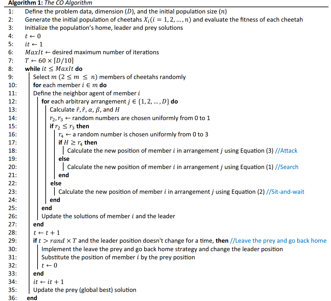 参考文献: Akbari, M.A., Zare, M., Azizipanah-abarghooee, R. et al. The cheetah optimizer: a nature-inspired metaheuristic algorithm for large-scale optimization problems. Sci Rep 12, 10953 (2022). https://doi.org/10.1038/s41598-022-14338-z