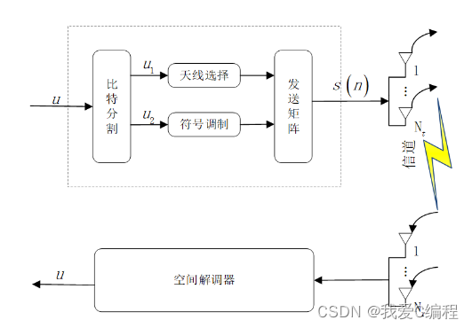 (1×N)∈R。经过比特分割后得到u 1 ( 1 × N 1 ) ∈ R u_{1(1\times N_1)}\in\Ru 1(1×N 1)∈R,用于选择天线,其中N 1 N_1N 1为用于选择天线的比特数;u 2 ( 1 × ( N − N 1 ) ) ∈ R u_{2(1\times (N-N_1))}\in\Ru 2(1×(N−N 1))∈R,用于调制符号的映射。空间调制系统模型如图1-1所示。