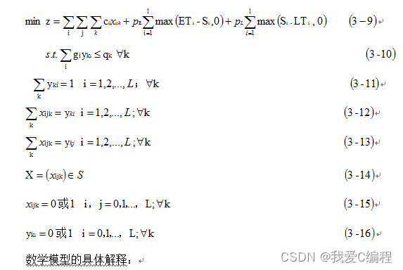 带时间窗的车辆路径选择问题模型描述: 有一个中心仓库,拥有车辆K辆, 容量都为q,现有L个发货点运输任务需要完成,以1,2,…,L表示,第i个发货点的货运量为gi,max(g)i≤max(qi),完成发货点i任务需要的时间(装货或卸货)表示Ti,且任务i必须再时间窗口[ETi,LTi]完成,其中ETi为任务i的允许最早开始的时间,LTi为任务i允许最迟开始的时间,如果车辆到达发货点i的时间早于开始时间,则车辆需要在i处等待;如果车辆到达时间晚于LTi,任务i将被延迟进行。