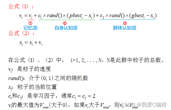 PSO初始化为一群随机粒子(随机解)。然后通过迭代找到最优解。在每一次的迭代中,粒子通过跟踪两个“极值”(pbest,gbest)来更新自己。在找到这两个最优值后,粒子通过下面的公式来更新自己的速度和位置。