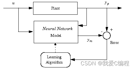 模型预测控制的第一阶段是训练神经网络来表示被控对象的前向动态。被控对象输出和神经网络输出之间的预测误差用作神经网络训练信号。该过程如下图所示:
