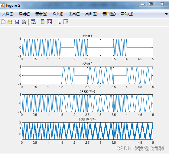 在二进制频移键控(2FSK)中,当传送“1”码时对应于载波频率,传送“0”码时对应于载波频率。 2FSK信号波形可看作两个2ASK信号波形的合成,下图是相位连续的2FSK信号波形。