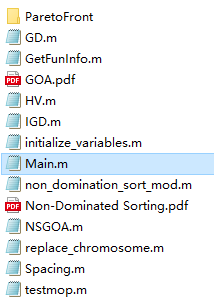 文件夹内包含NSGOA求解46个多目标测试函数(ZDT1、ZDT2、ZDT3、ZDT4、ZDT6、DTLZ1-DTLZ7、WFG1-WFG10、UF1-UF10、CF1-CF10、Kursawe、Poloni、Viennet2、Viennet3)、一个工程应用(盘式制动器设计)和四种IGD、GD、HV、SP评价指标的完整代码,同时提供瞪羚优化算法的参考文献GOA.pdf和非支配原理的文献。代码中点击main.m即可运行,包含部分注释。