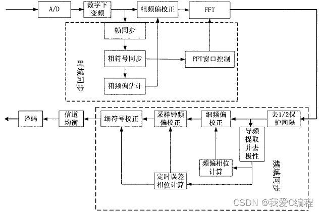 注意系统中的虚线部分就是你要做的OFDM的频域同步模块。我们的MATLAB代码就是参考这个系统结构进行设计的。其中虚线就是本课题要做的代码部分。