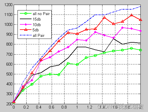 从上面的仿真结果可知,采用全配对的方法,可以获得较大的数据吞吐量,但是其数据丢失率也较大,所以设计了基于SINR的配对算法,这样可以根据实际的噪声等干扰因素的影响来进行合理的配对。