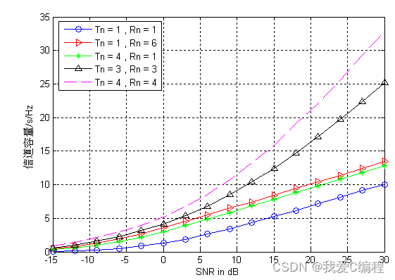 平均功率分配的MIMO信道容量:通过Matlab仿真在加性高斯白噪声情况下的SISO (1*1)、SIMO(1*6)、MISO(4*1)、MIMO(3*3)、MIMO(4*4)系统的信道容量进行分析。