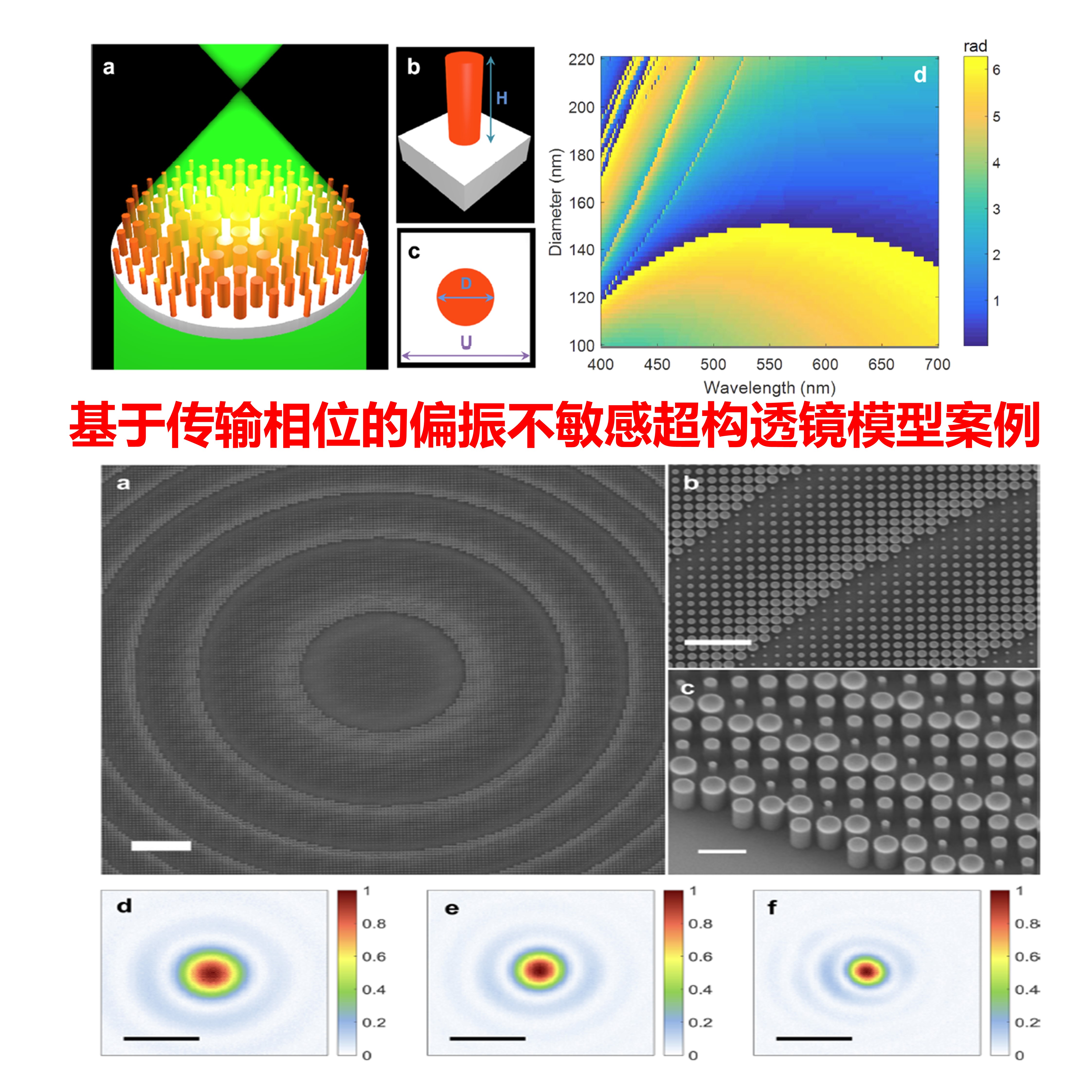 论文介绍:单元结构为二氧化钛圆构成,具有偏振不敏感的特性,通过调整圆柱的半径实现连续的相位调节,构建具有聚焦相位分布的超构透镜模型,可实现可见光波段的聚焦和成像;