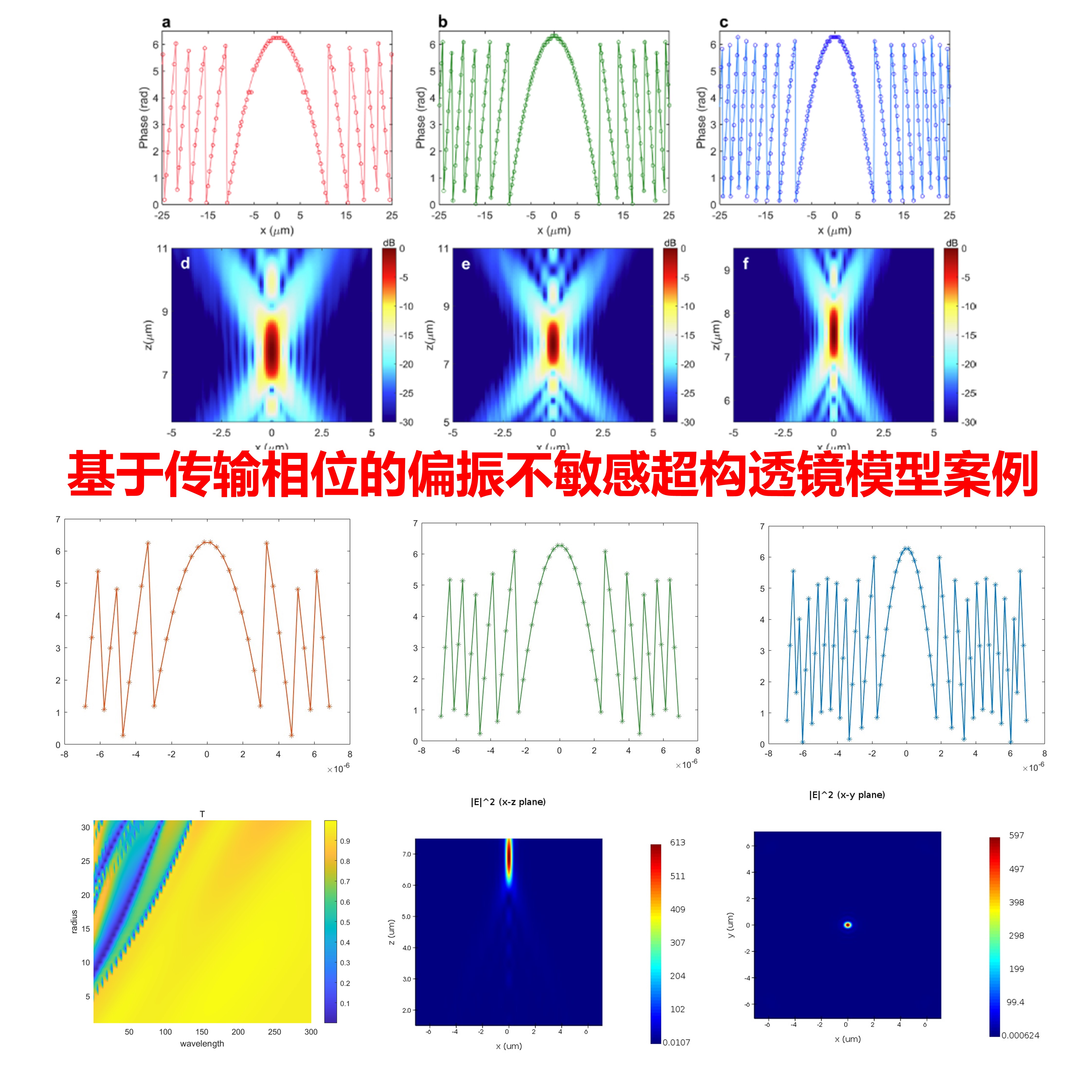 案例内容:主要包括二氧化钛纳米柱的单元结构仿真、传输相位的参数扫描计算,超构透镜的双曲相位计算代码以及可见光波段405nm 532nm和633nm三个波长的超构透镜模型,和对应的远场电场分布计算以及聚焦效率计算;