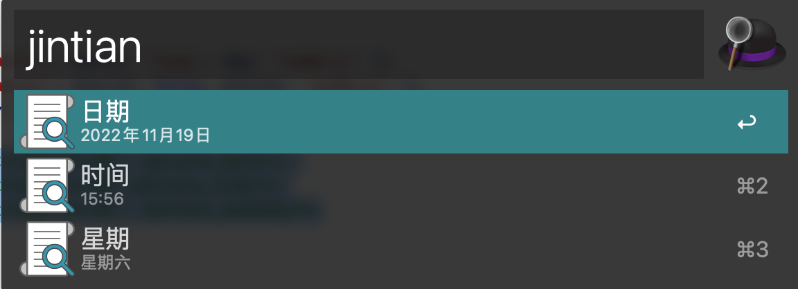最后我会给出一个自己的workflow案例,它可以显示今天的日期、时间和星期几,如下所示。