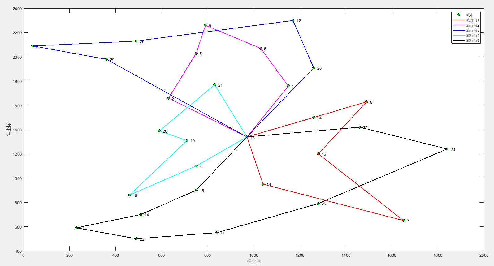 Tnum=5;%旅行商个数(可以自行更改)