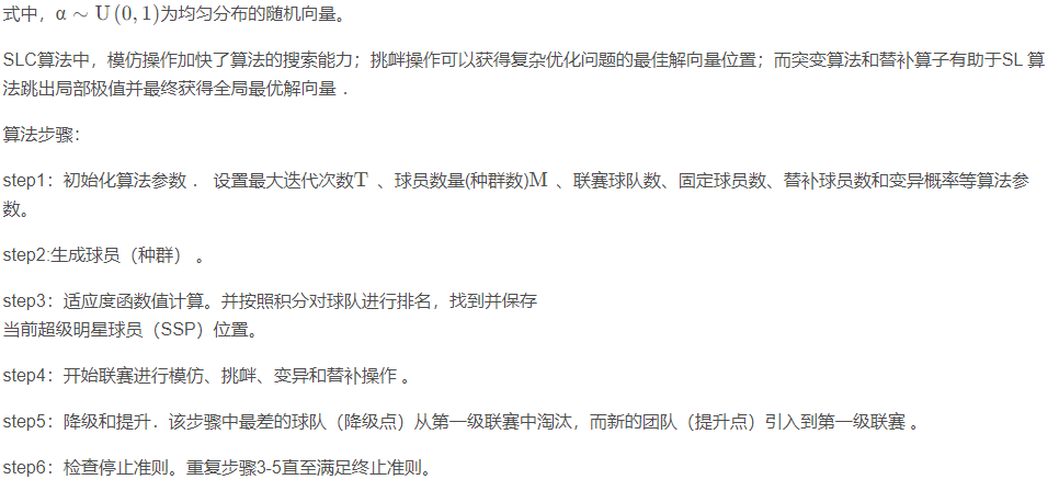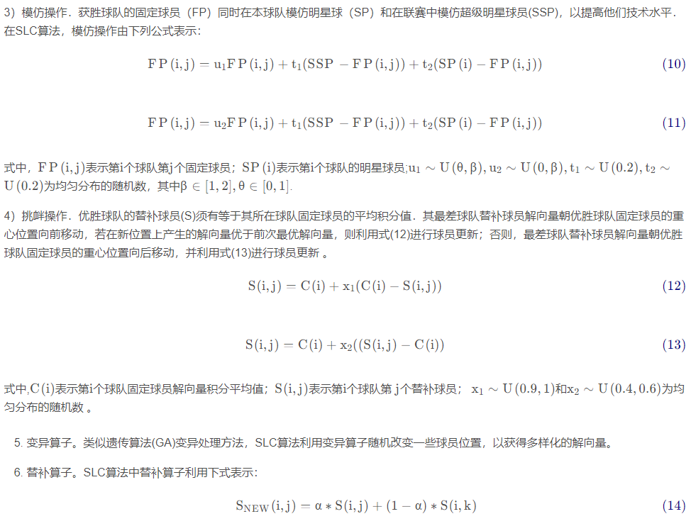 足球联赛竞争算法(Soccer league competition algorithm,SLC)由Naser Moosavian和Babak Kasaee Roodsari于2014年提出,该算法受足球联赛球队和球员间竞争启发而得。该算法将球员(种群个体)分为固定球员和替补球员,并由此组成若干球队,球队之间、球员之间相互竞争,并采取积分排名方式将球队排名最前的球员位置作为待优化问题的最优解 。
