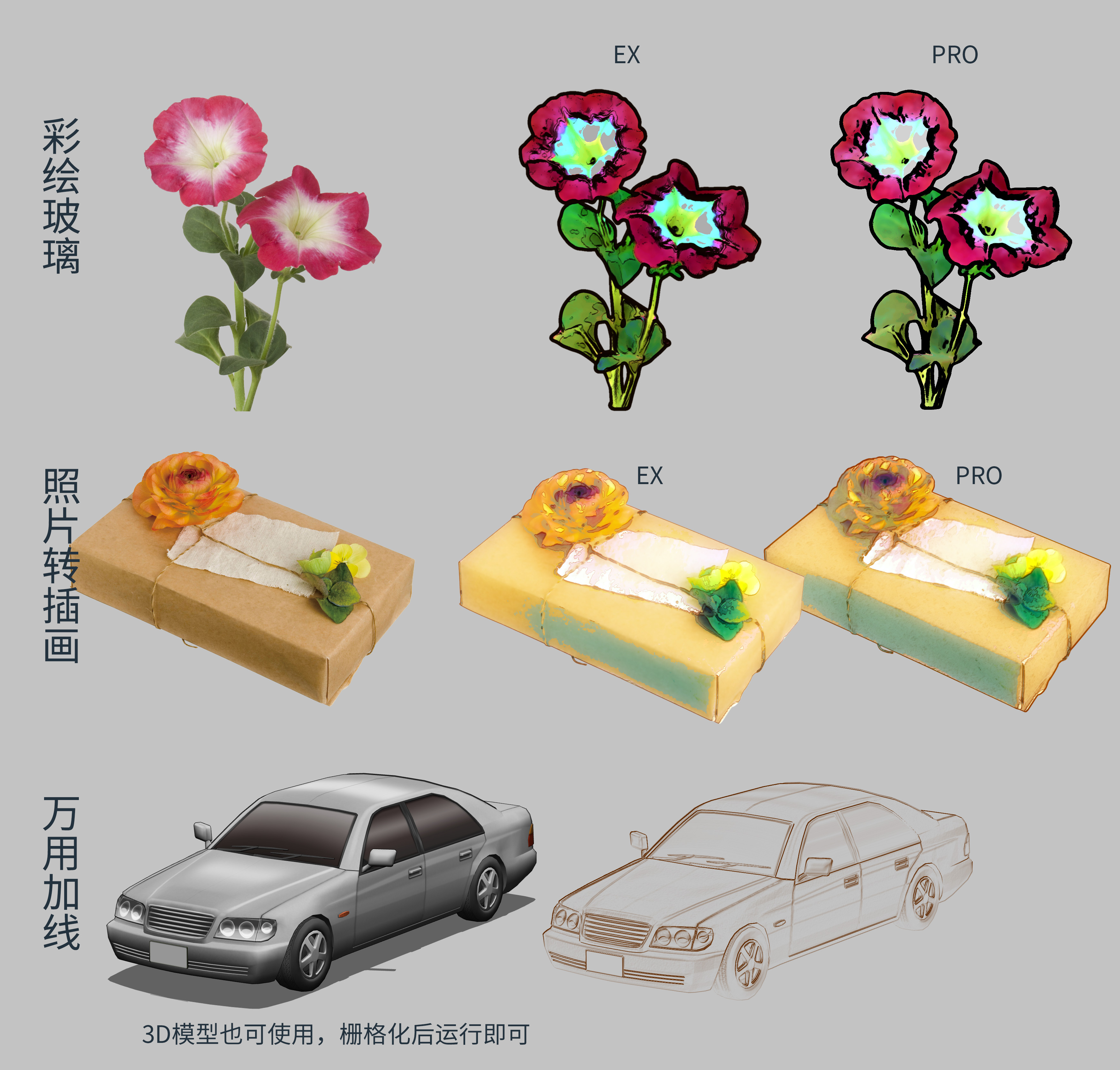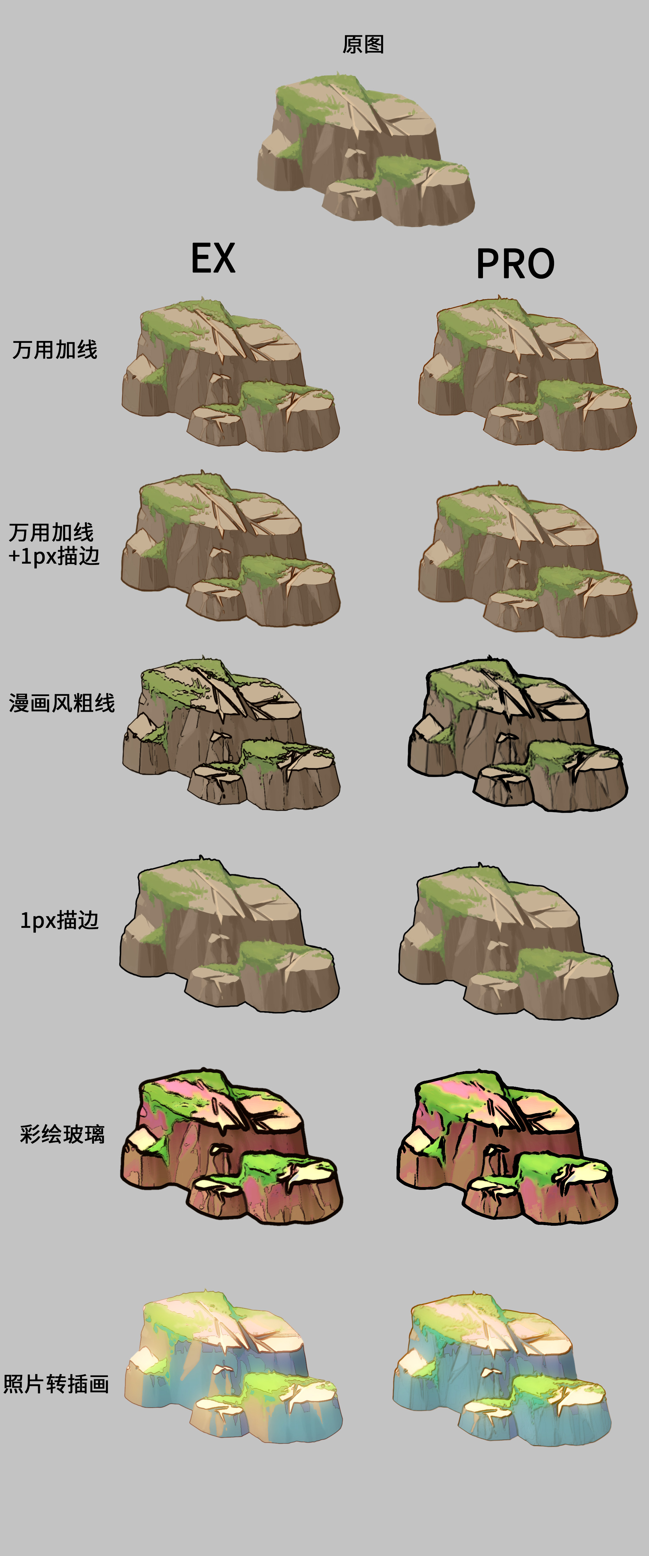 厚涂插画、3D模型均适用 照片一键转分图层插画!美漫风/彩绘玻璃风一键生成!并且线稿也是单独图层! 一共含有5种完全不同风格的线稿处理动作。