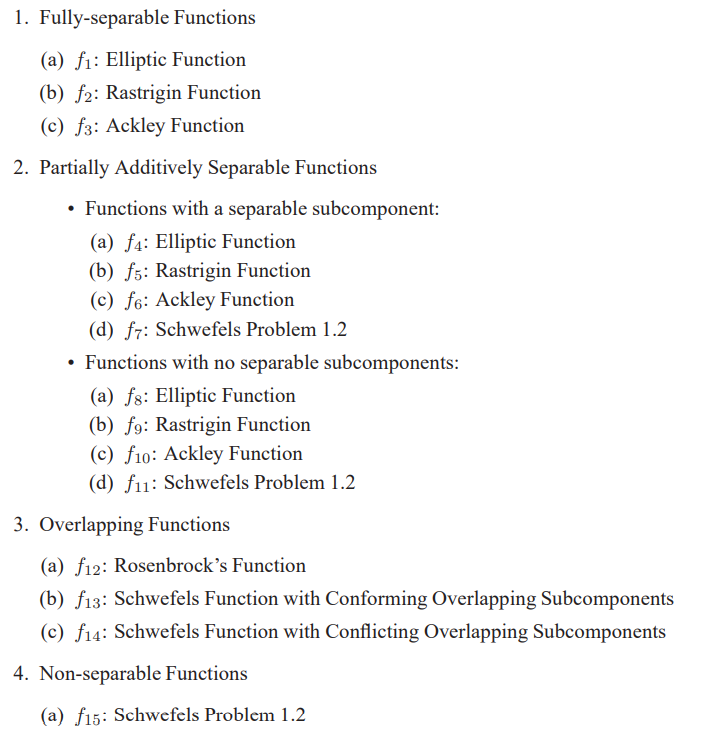 CEC2013 (LSGO)共有15个测试函数,每个测试函数其维度为1000,理论最优值均为。CEC2013 (LSGO)中每个测试函数极具挑战力,求解十分困难。测试函数详细信息如下: