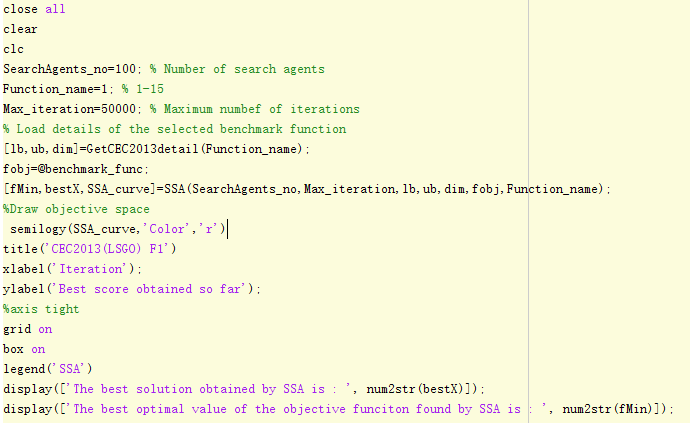 将麻雀搜索算法运用于求解CEC2013(LSGO)中15个大规模无约束函数,其中增大迭代次数,SSA的求解效果更佳。在本例中,SSA的种群大小为100,最大迭代次数为50000次。