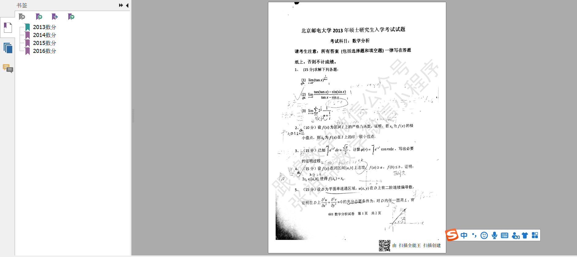 北京邮电大学2013-2016年数学分析考研试题及手写参考解答