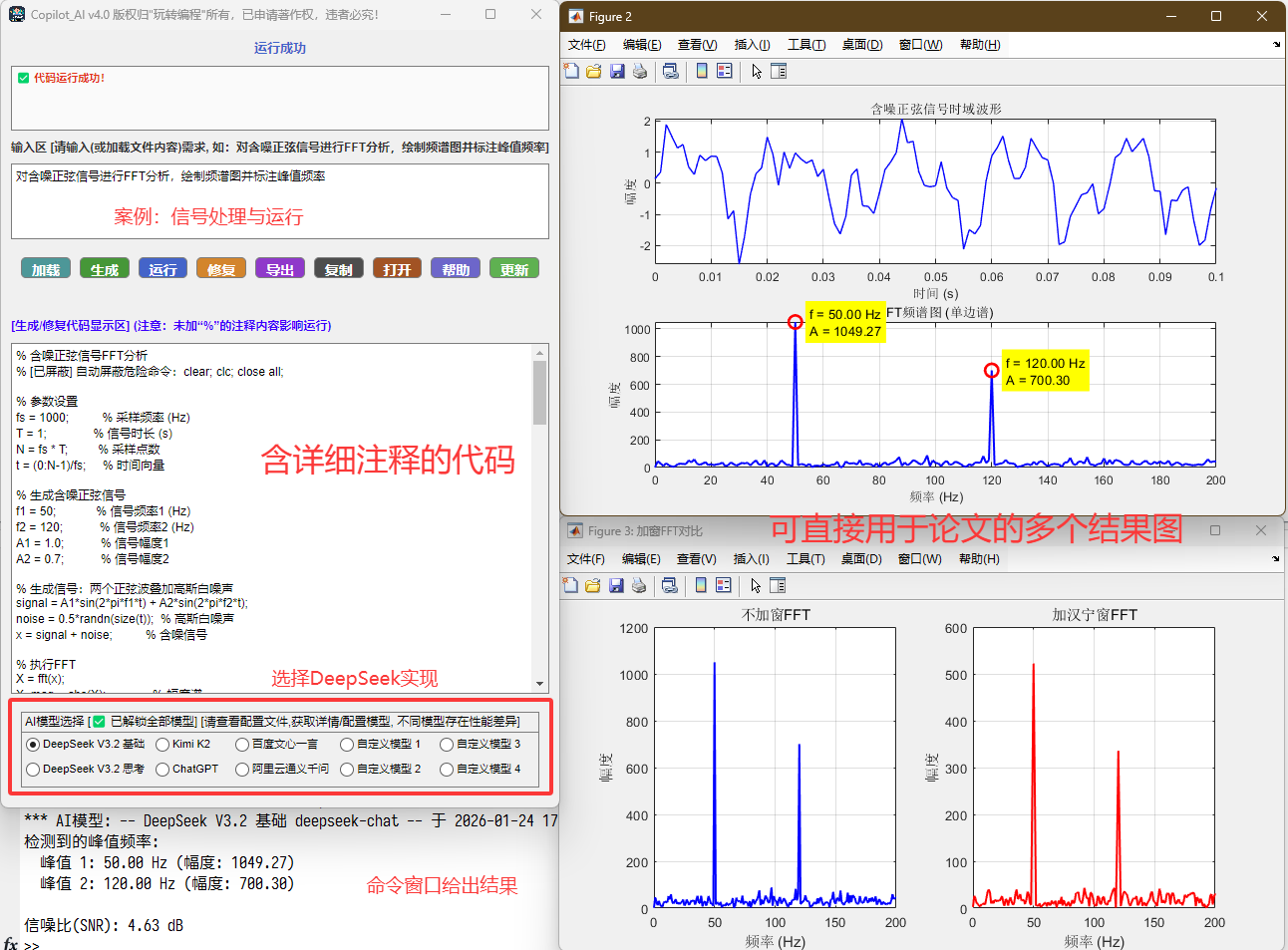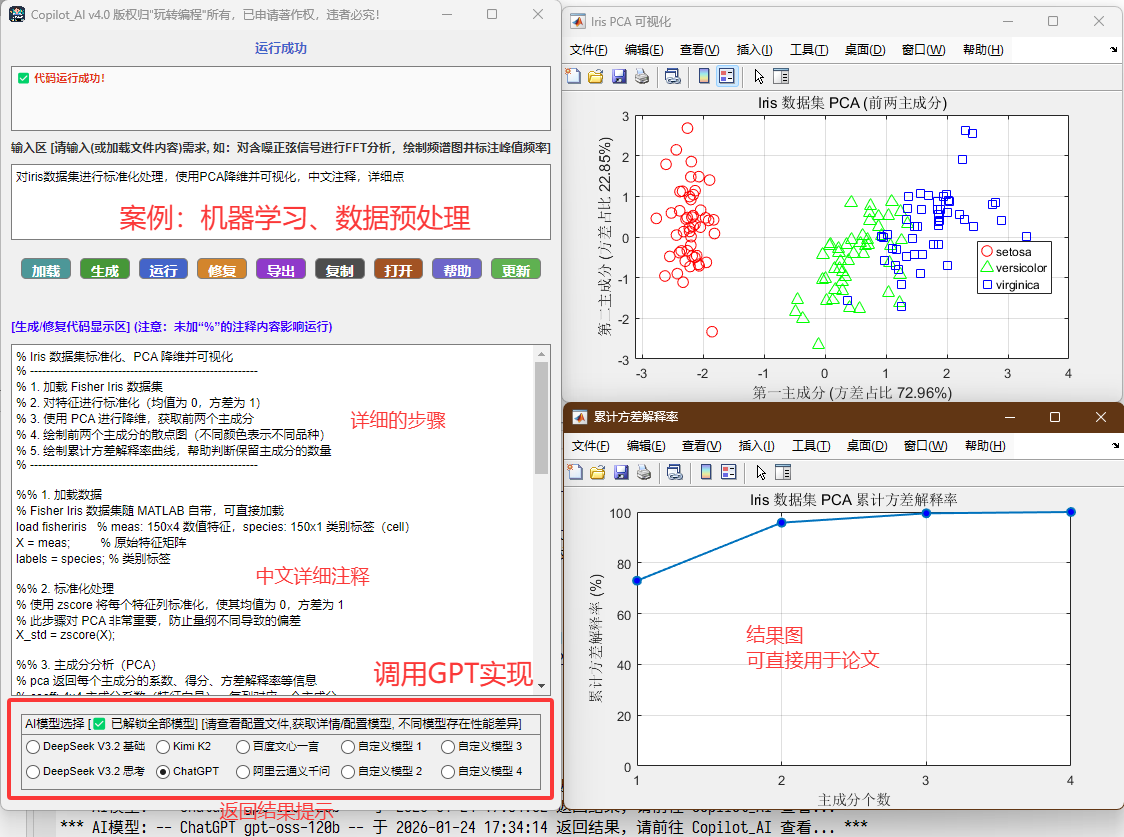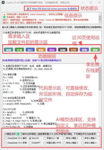 - 20250823更新至 v2.2, 更新:1). 接入已全面升级为全新旗舰模型 DeepSeek-V3.1,非思考模式和思考模式可选。2). 修复窗口越界,部分小屏幕用户打开默认最小化问题;3). 提示语功能增强,显示更丰富;4). 修复部分bug(如加载的文件中包括“clear”命令,会清除程序obj和Fig本身),稳定性提高。