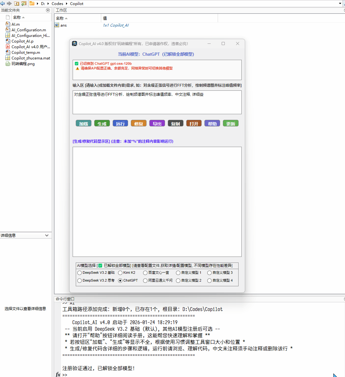 - 20251101更新至 v3.0,更新:1).增加生成/修复代码时自动注释中文解释的功能;2). 增加“帮助”按钮,便于用户查看手册,易于使用工具箱;3). “代码显示区”增加可直接编辑的功能,提醒更新并自动替换临时文件;4). 增加API更改后的对比及提醒功能;5). 修复初始打开工具窗口显示不全的问题;6). 其他bug修复(如功能提醒),简化流程,提供流畅度;7). 设置生成临时程序文件“Copilot_temp.m”文件夹为工具箱同级。