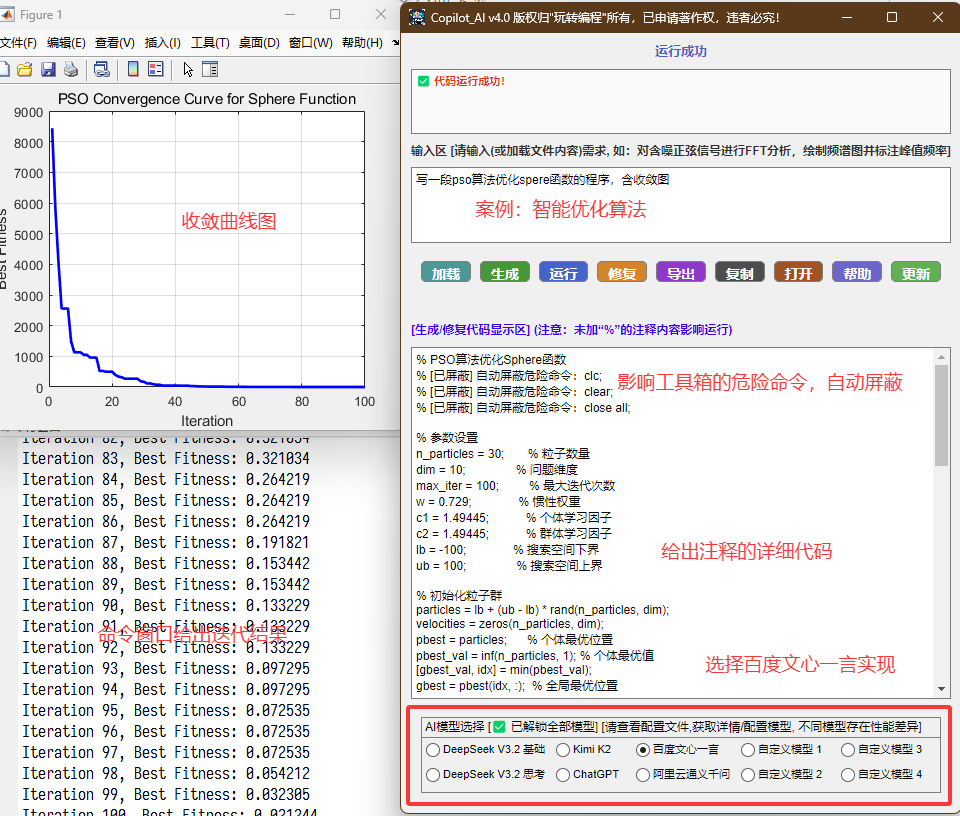 这款Matlab Copilot_AI工具箱作为Matlab与多款AI模型的对接载体,支持DeepSeek V3.2(基础/思考版)、Kimi K2、百度文心一言、阿里云通义千问、ChatGPT(百度千帆版)等模型,还支持4种自定义模型配置(可对接百度千帆平台近百种大模型);