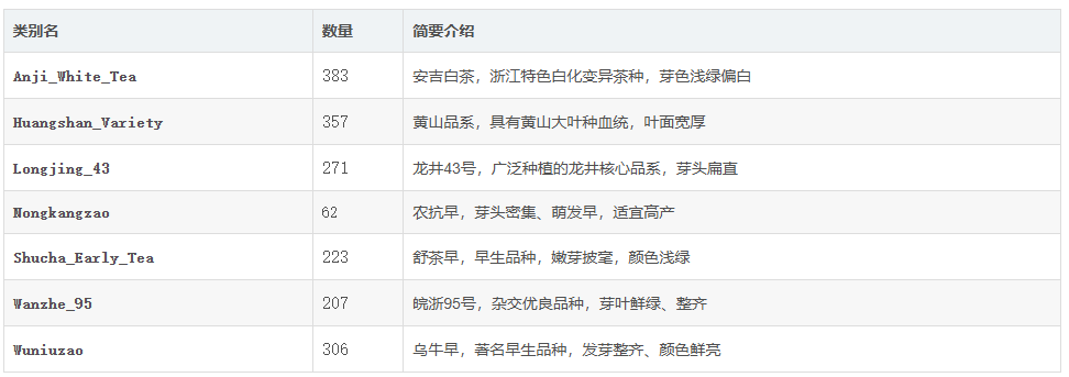 数据集中共包含 7 种茶叶品种,均为典型的地方优质品种,类别标签如下: