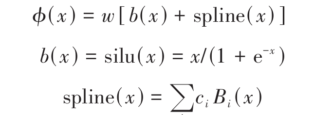 式中: x1,x2, ⋅⋅⋅ ,xn 为输入特征; Φq 和 ϕq,p 均为单变量连续函数, Φq 为外层函数, ϕq,p 为内层函数。在训练过程中, KAN 通过 Φq,ϕq,p 构建输入特征与共享单车需求量之间的复杂映射关系。激活函数 ϕ(x) 表达式为: