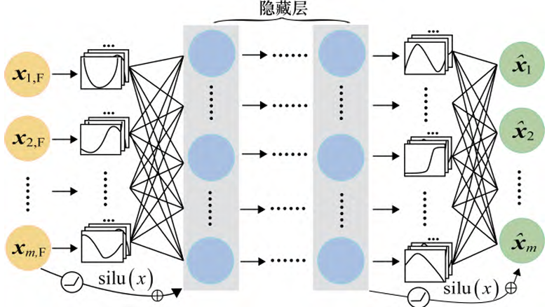 式中: w 和 ci 均为可学习参数; b(x) 为偏置激活函数,在 KAN 中该函数被初始化为 silu 激活函数; spline(x) 为一组一维函数组合; Bi(x) 为预先定义的 Base- 样条基函数。在训练过程中样条参数 ci 持续优化,以调整样条形状,使得能够准确描述特征与需求量之间的非线性关系,从而拟合训练数据。