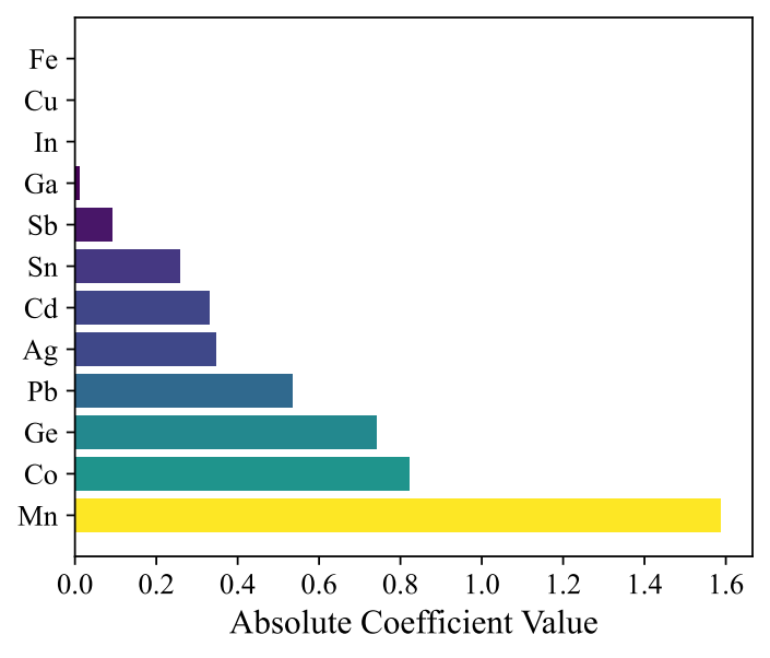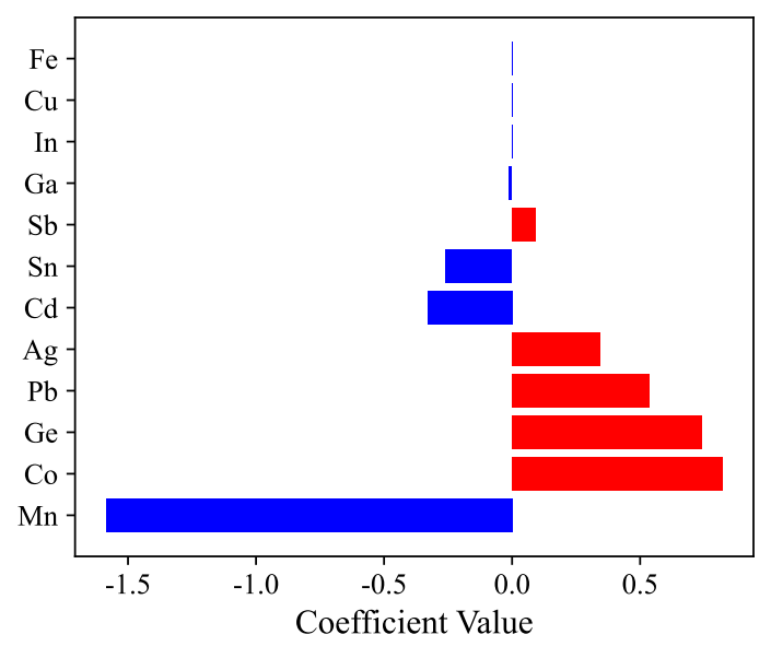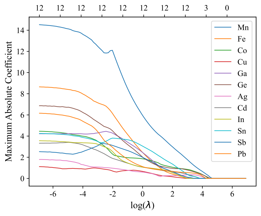 Features selected with lambda_min: ['Mn', 'Fe', 'Co', 'Cu', 'Ga', 'Ge', 'Ag', 'Cd', 'In', 'Sn', 'Sb', 'Pb']