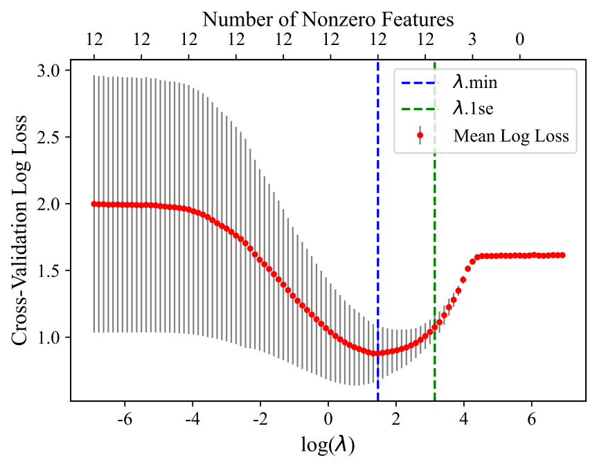 作用:通过10折交叉验证确定最优的λ值。图中展示了不同λ下的交叉验证误差(二项偏差)以及误差的变化范围(标准差)。