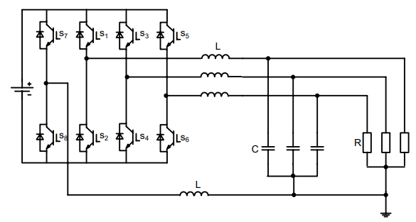 三相四桥臂逆变器是在传统的三相桥式逆变器的基础上增加了一个桥臂,该桥臂的作用是形成中点,这样通过增加一个桥臂来直接控制中性点电压,并且产生中性点电流流入负载,这就增加了一个自由度,使三相四桥臂对逆变电源可以产生三个独立的电压,从而使其有在不平衡负载下维持三相电压的对称输出的能力。这种电路拓扑具有较高的直流利用率,并且直流输入电容较小;减小不平衡 负载时三相输出的不对称度。通常情况下,在中线上添加电感,可改善系统输出端的滤波效果,抑制线路中的开关纹波及减小三相电压的谐波。