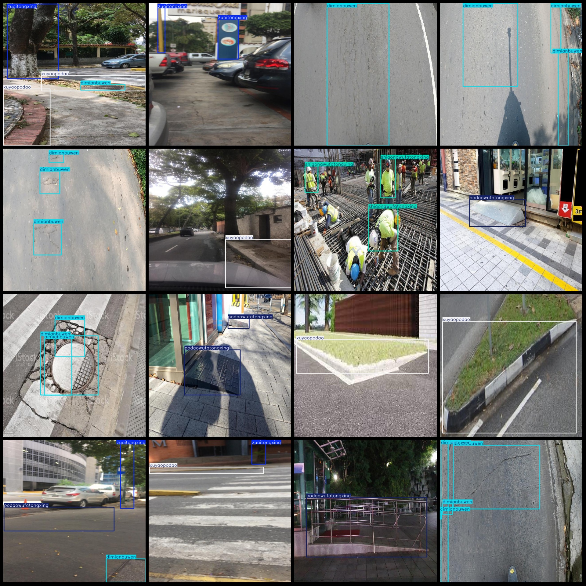标注类别名称(注意yolo格式类别顺序不和这个对应,而以labels文件夹classes.txt为准):["dimianbuwen","podaowufatongxing","shigongwufatongxing","xuyaopodao","zuaitongxing"]