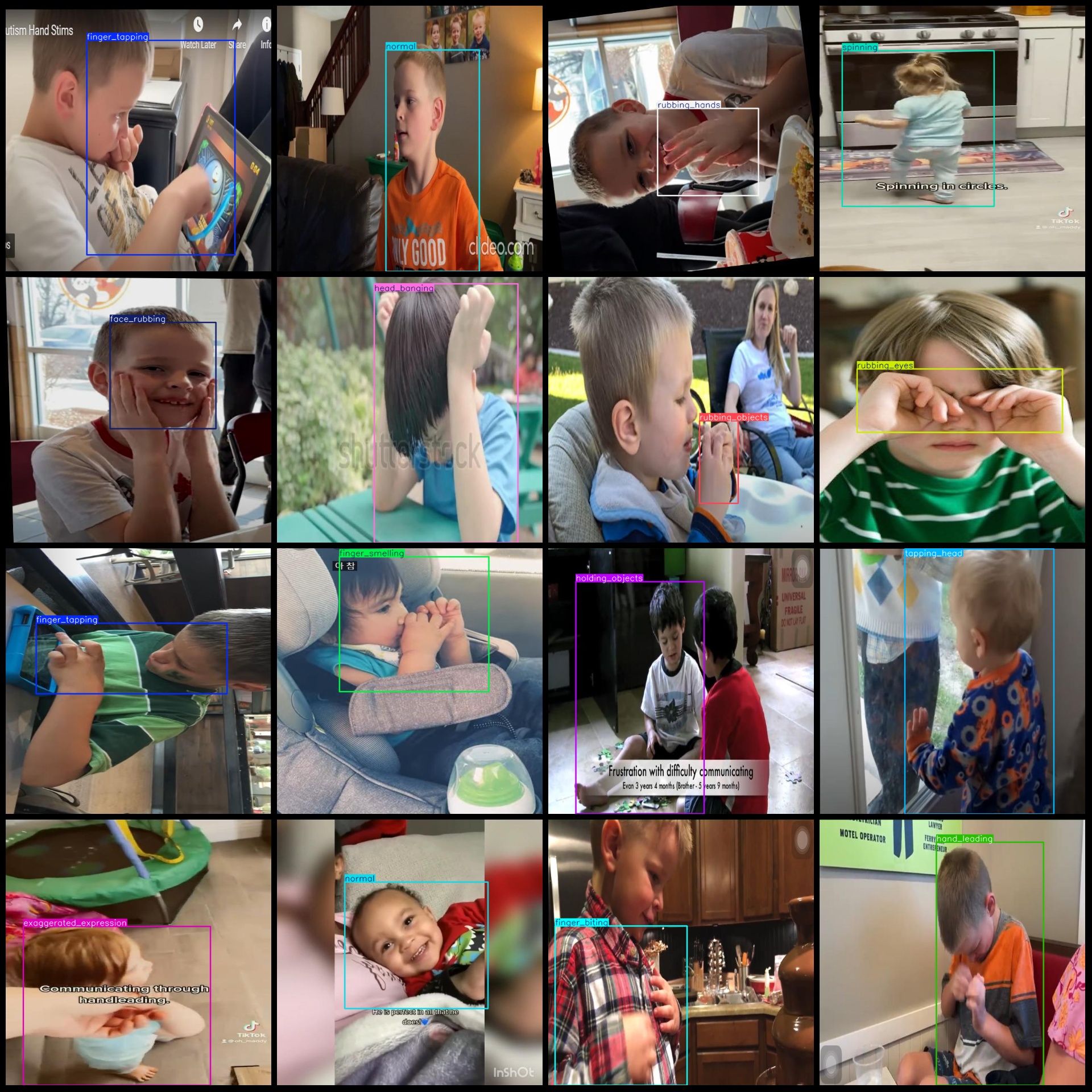 标注类别名称(注意yolo格式类别顺序不和这个对应,而以labels文件夹classes.txt为准):["Lack_social_skill","Stimming","aligning_objects","avoid_eye_contact","awkward_posture","clapping","closing_eyes","continuous_moving","exaggerated_expression","face_rubbing","finger_biting","finger_flapping","finger_smelling","finger_tapping","hand_flapping","hand_leading","head_banging","holding_objects","jumping","lack_of_awareness","lack_of_response","moving_hand_upforth","normal","repetitive_action","rocking","rubbing_eyes","rubbing_hands","rubbing_nose","rubbing_objects","smelling","spinning","tapping_head","weird_expression","weird_laugh"]