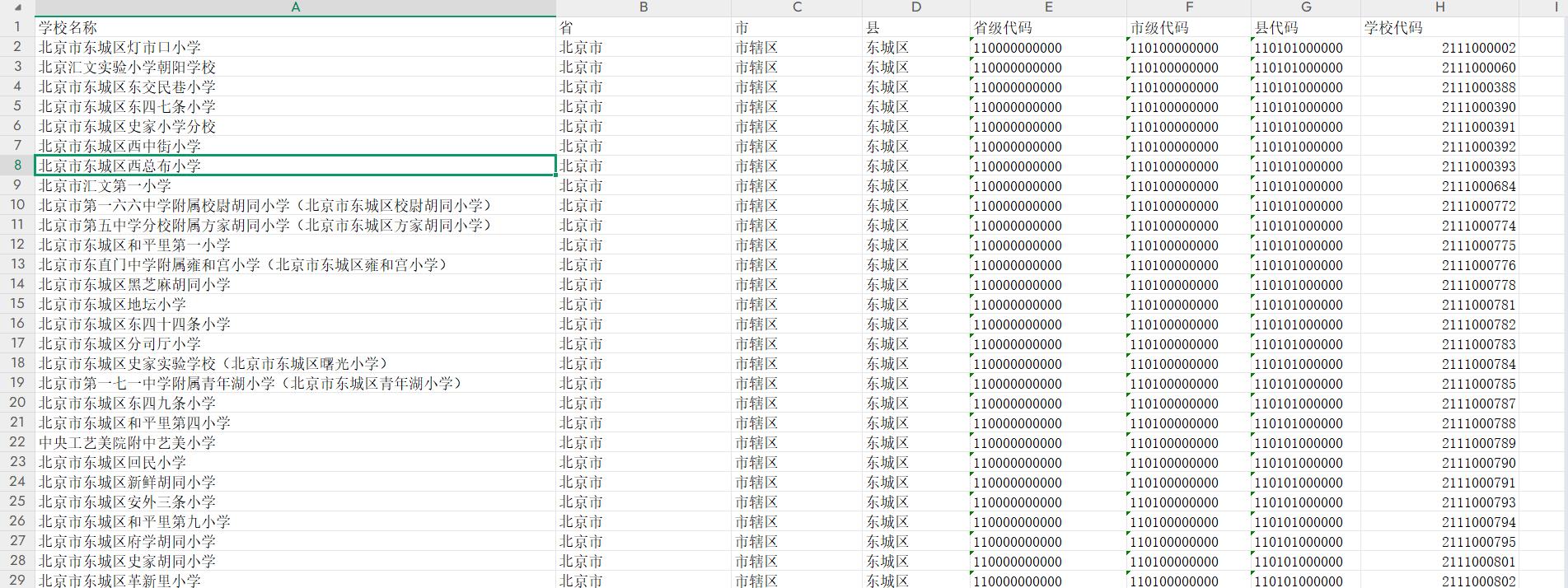 数据采集于2025年8月底,一共采集到215019个学校,包含全国高中、初中、技校、小学全部名称数据,含省/直辖市编码名称、地市编码及名称、区县编码及名称、学校编码及名称,数据来源学生体质健康网。注意由于这个是最新数据,可能官方网站实时更新了数据,可能和其他人数据有差异,请以最新采集数据为准。此外特别注意数据中不包含大学名称。以下是示例:
