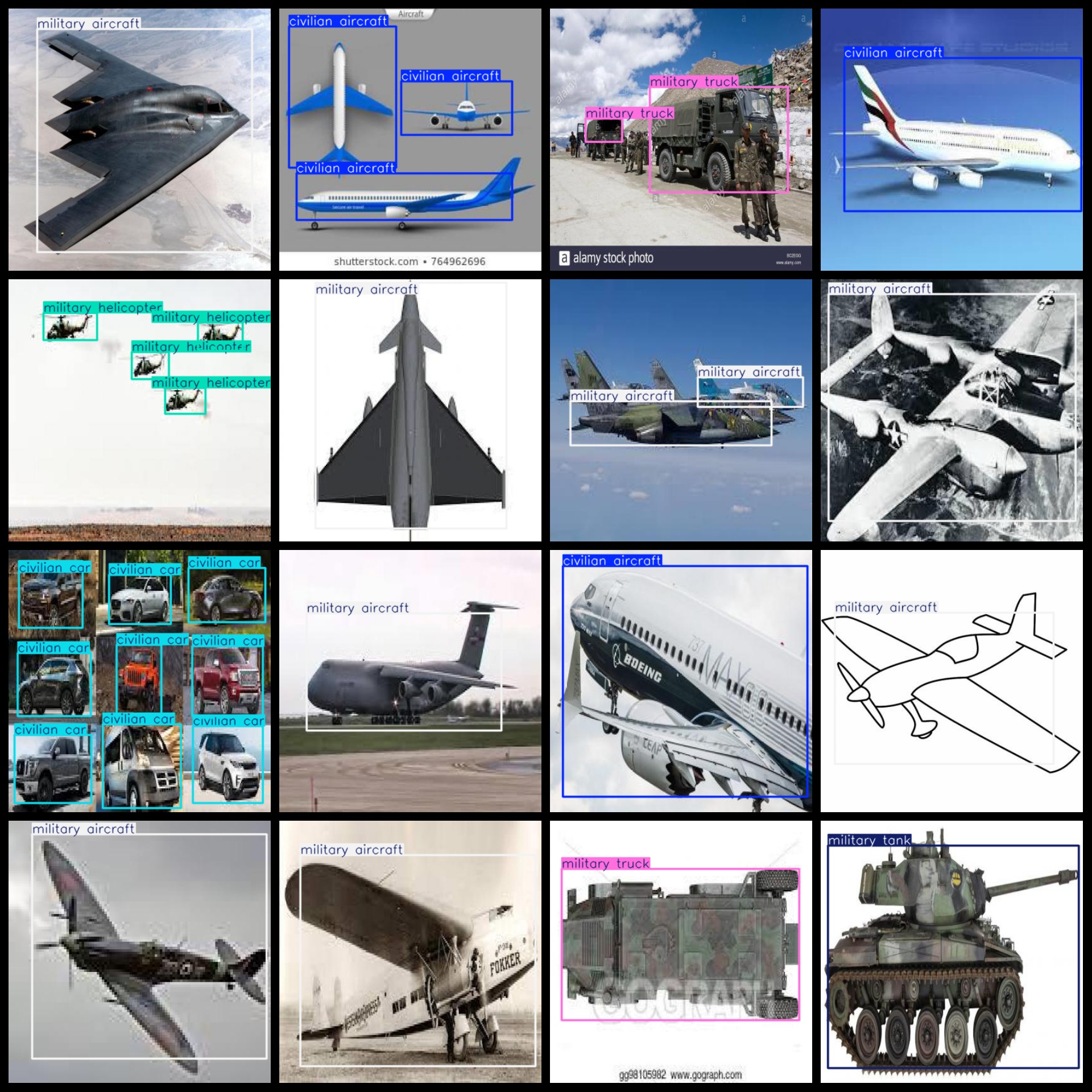 标签名称:["civilian aircraft","civilian car","military aircraft","military helicopter","military tank","military truck"]