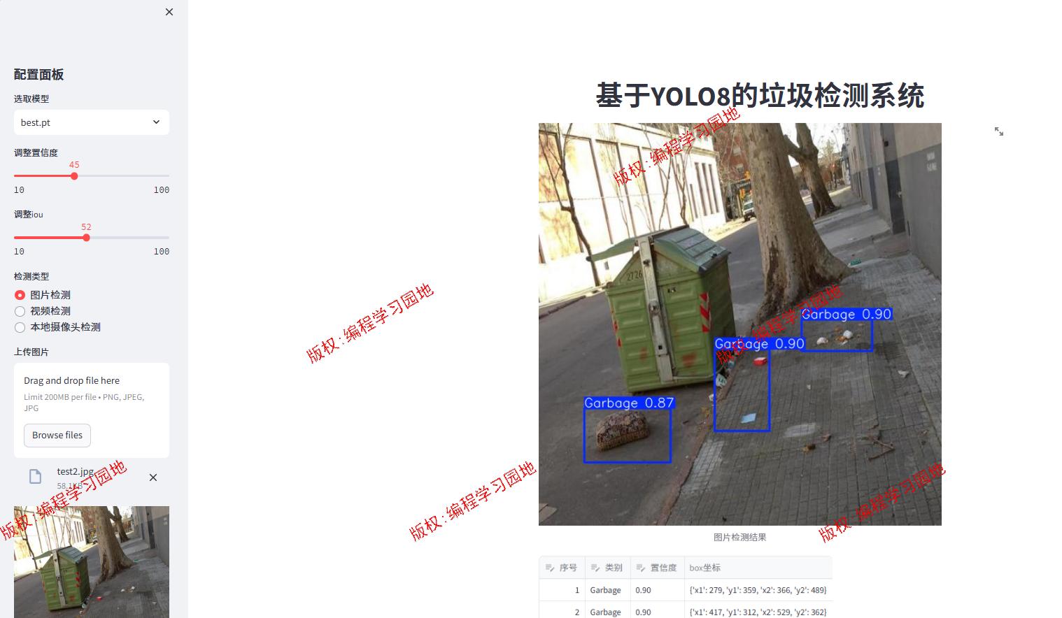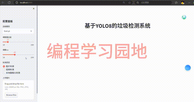 [2]可以通过UI界面动态调节模型置信度与IOU。系统可识别一类:垃圾