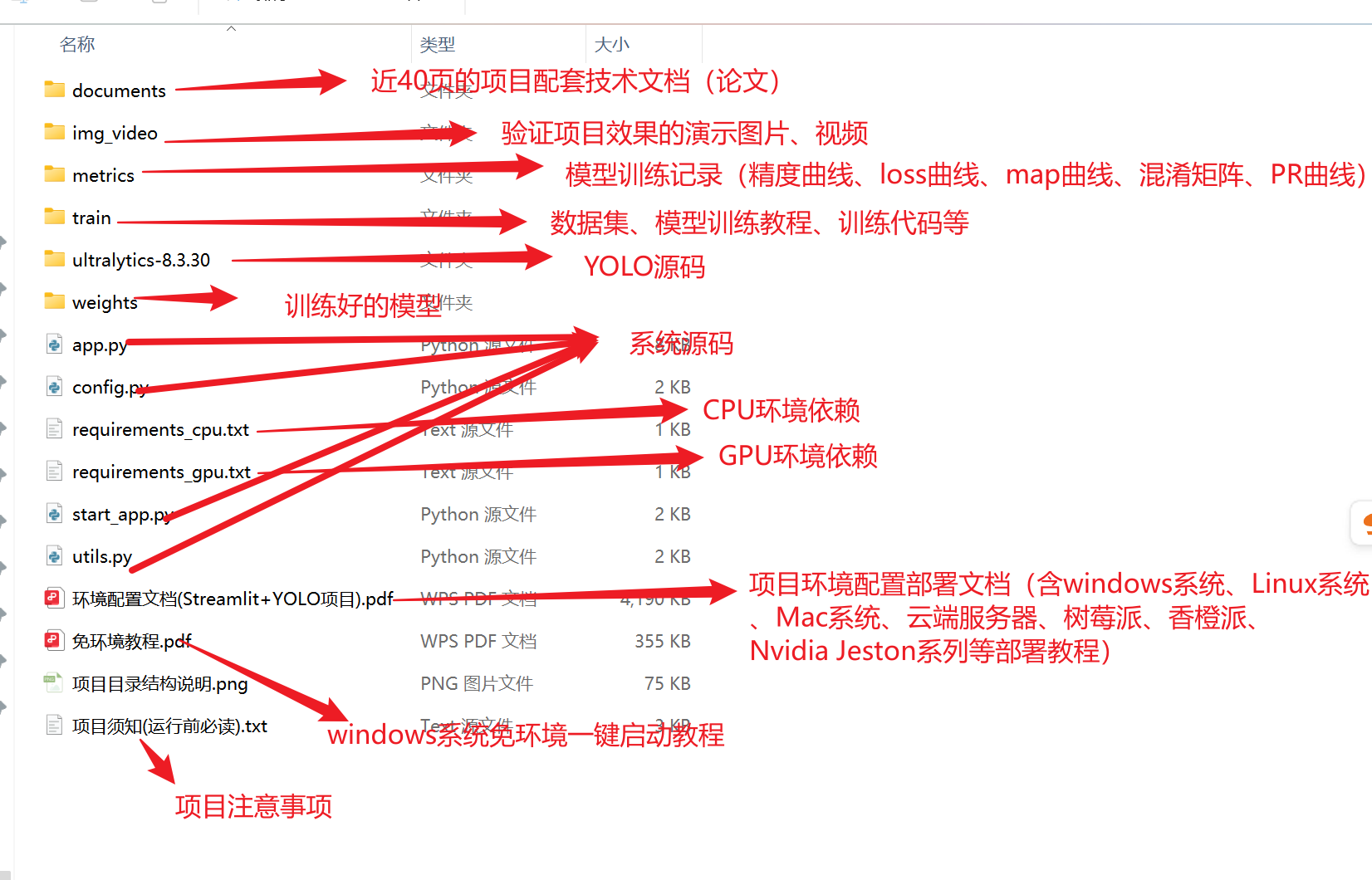 [3]系统目录下附带有非常详细的环境配置运行指导pdf文件(将近30页),包含windows系统、Liunx系统、MacOS、云端服务器、树莓派、香橙派、英伟达边缘盒子......等部署教程。如果是小白也没有关系,项目附带有免环境安装包教程,免环境安装包解压后,一键启动项目,不需要环境配置,无任何技术门槛,小白也能运行起来项目。因此,担心自己跑不通项目?不存在的,程序亲测无bug,店铺售出上千单,至今无一单存在跑不通项目的情况。
